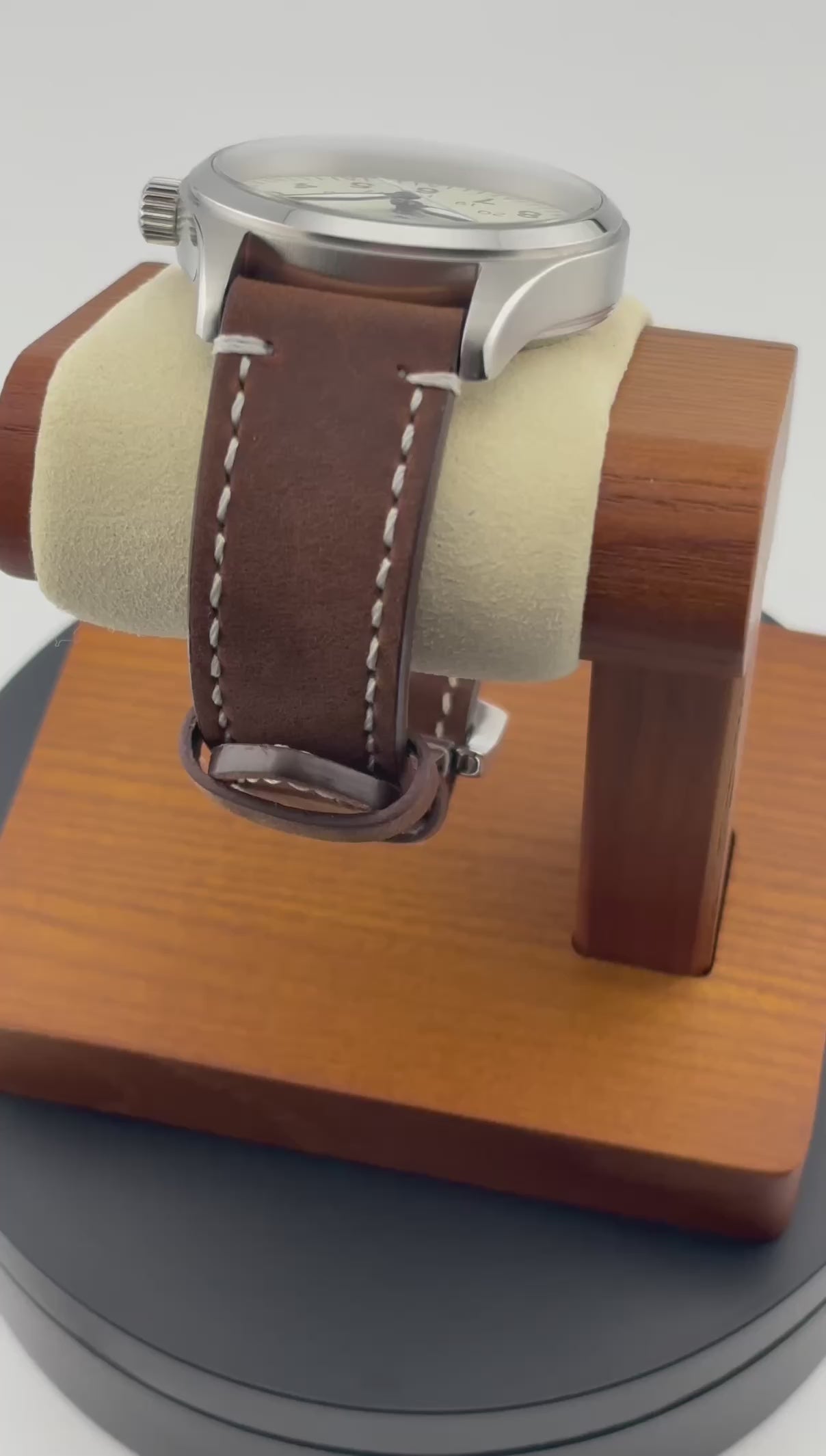Description: A classic, military-inspired, field style timepiece. Featuring a faded cream tone dial with a double set of outer & inner hour markers (to 12 and 24), exhibition case back, and durable but very comfortable leather stitched strap