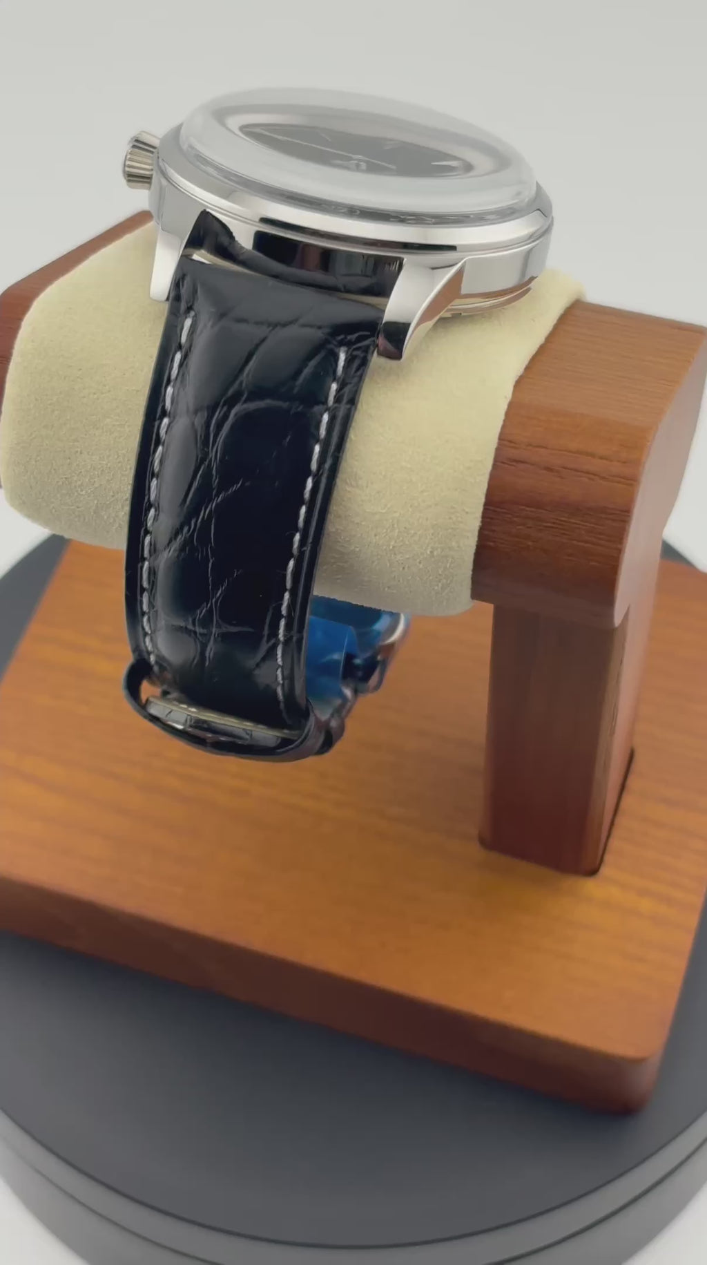 Strap: Genuine alligator leather, edged stitching, polished stainless steel butterfly deployment clasp