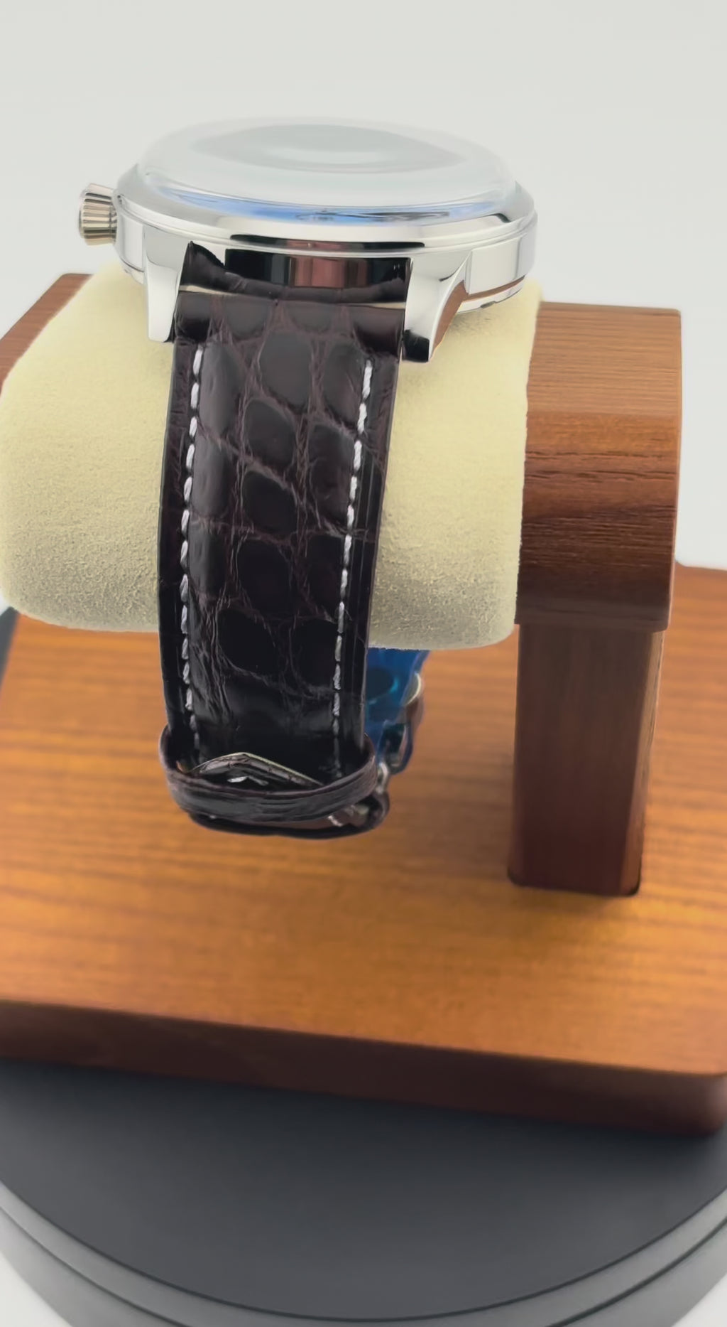 Strap: Genuine alligator leather, edged stitching, polished stainless steel butterfly deployment clasp