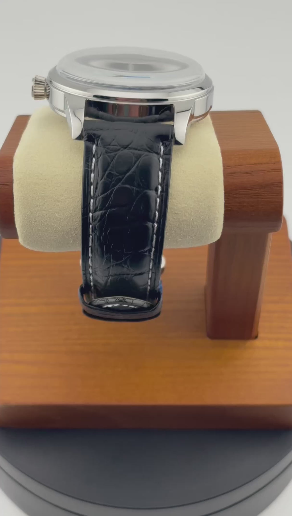 Strap: Genuine alligator leather, edged stitching, polished stainless steel butterfly deployment clasp