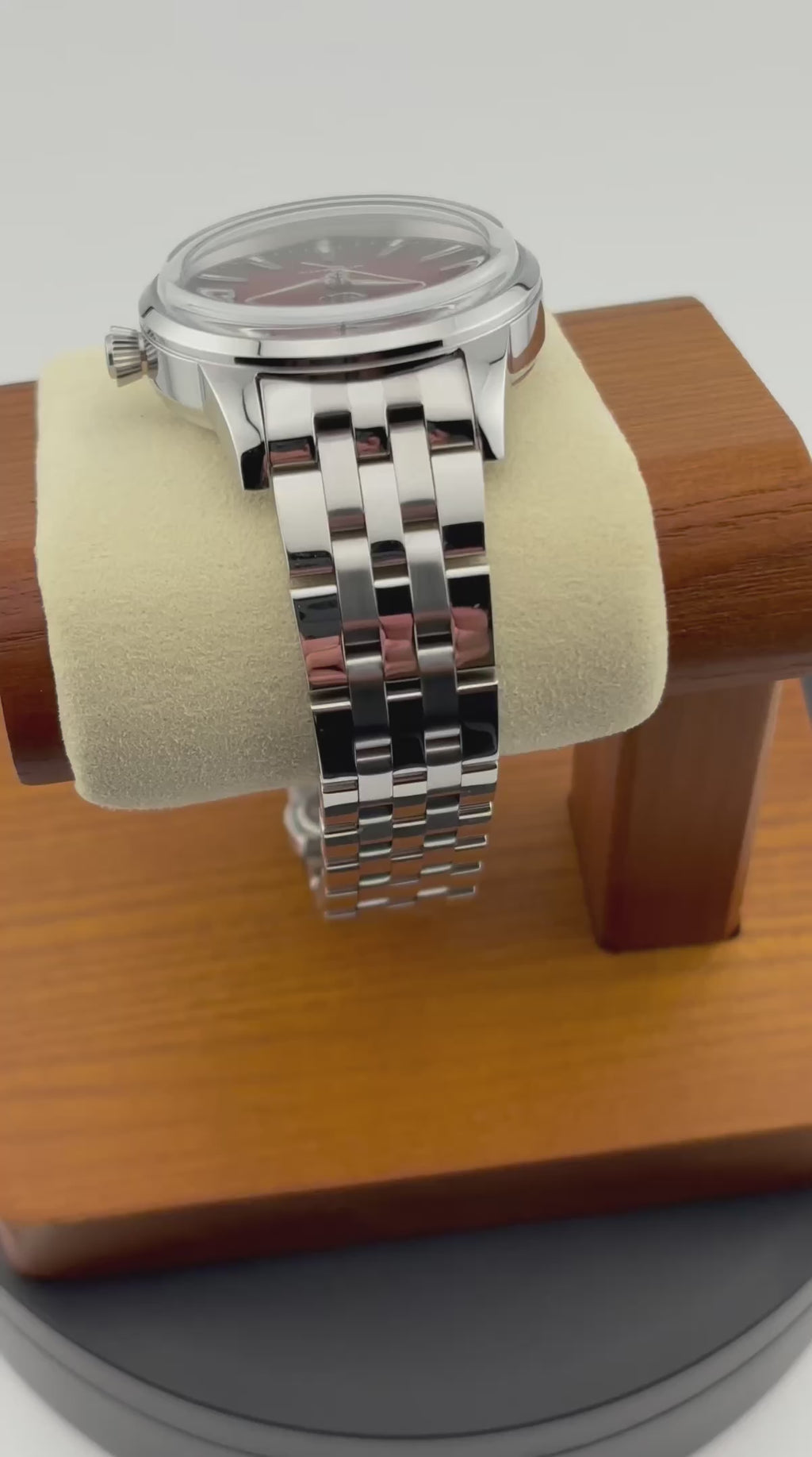 Description: An elegant ladies cocktail watch, featuring a stainless steel case & bracelet, deep red faded sunburst dial, lumed hands, exhibition caseback and colour-matched custom rotor